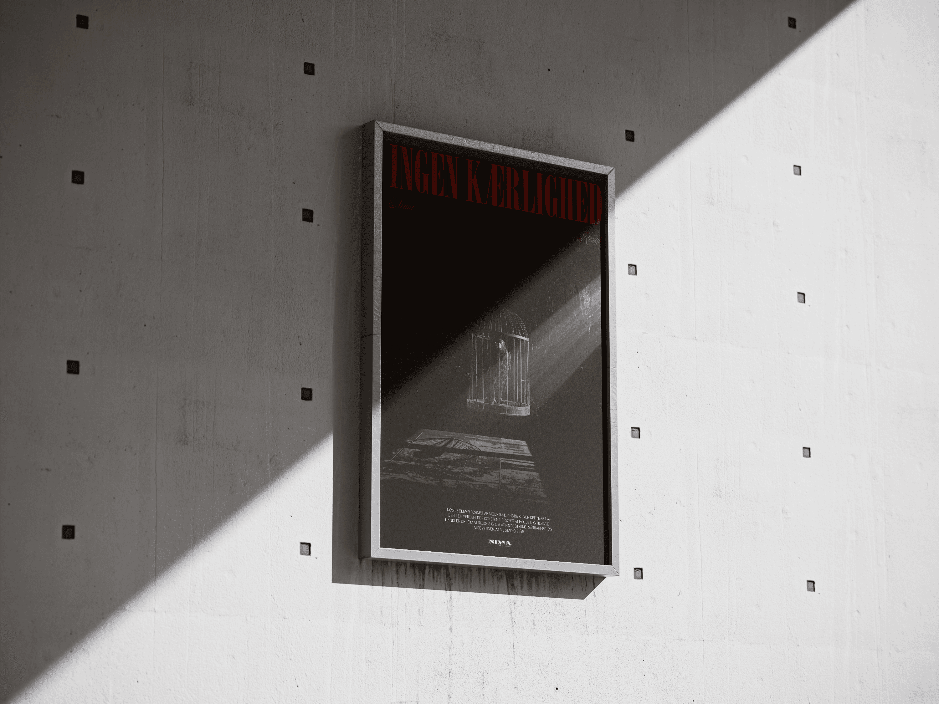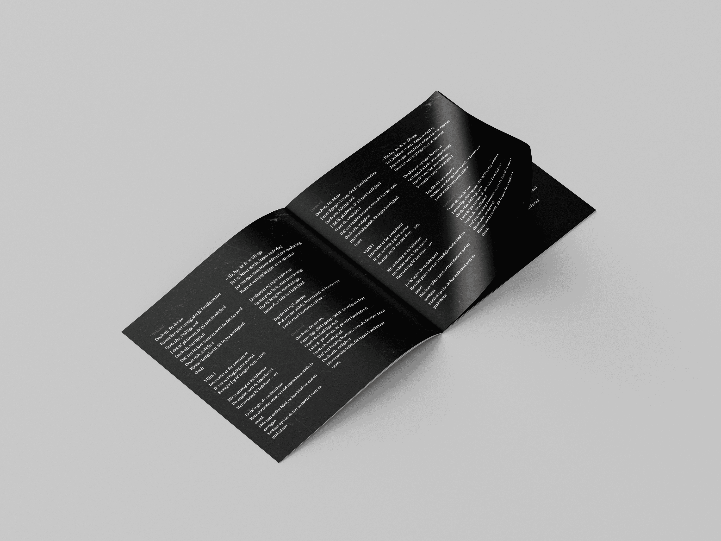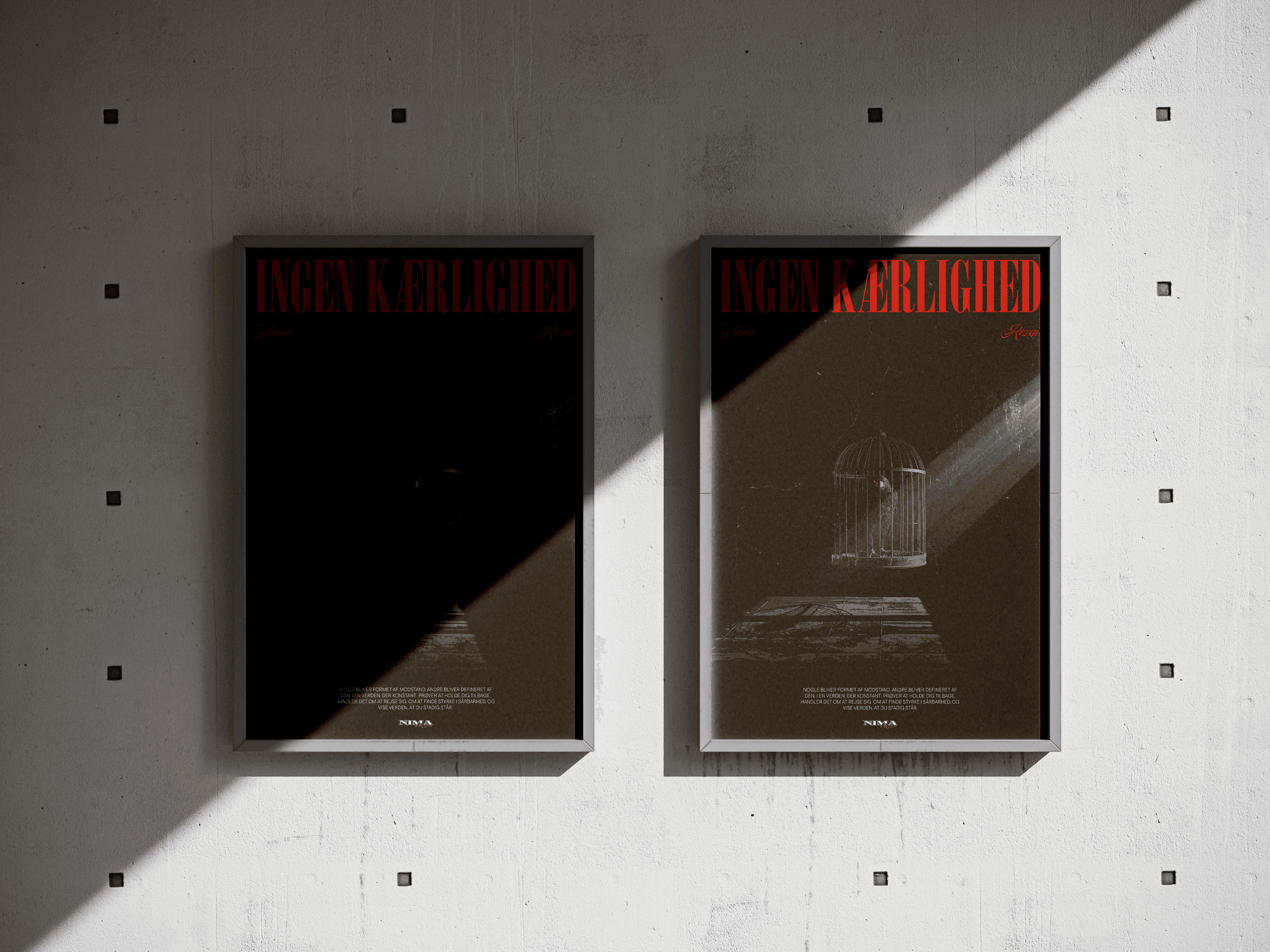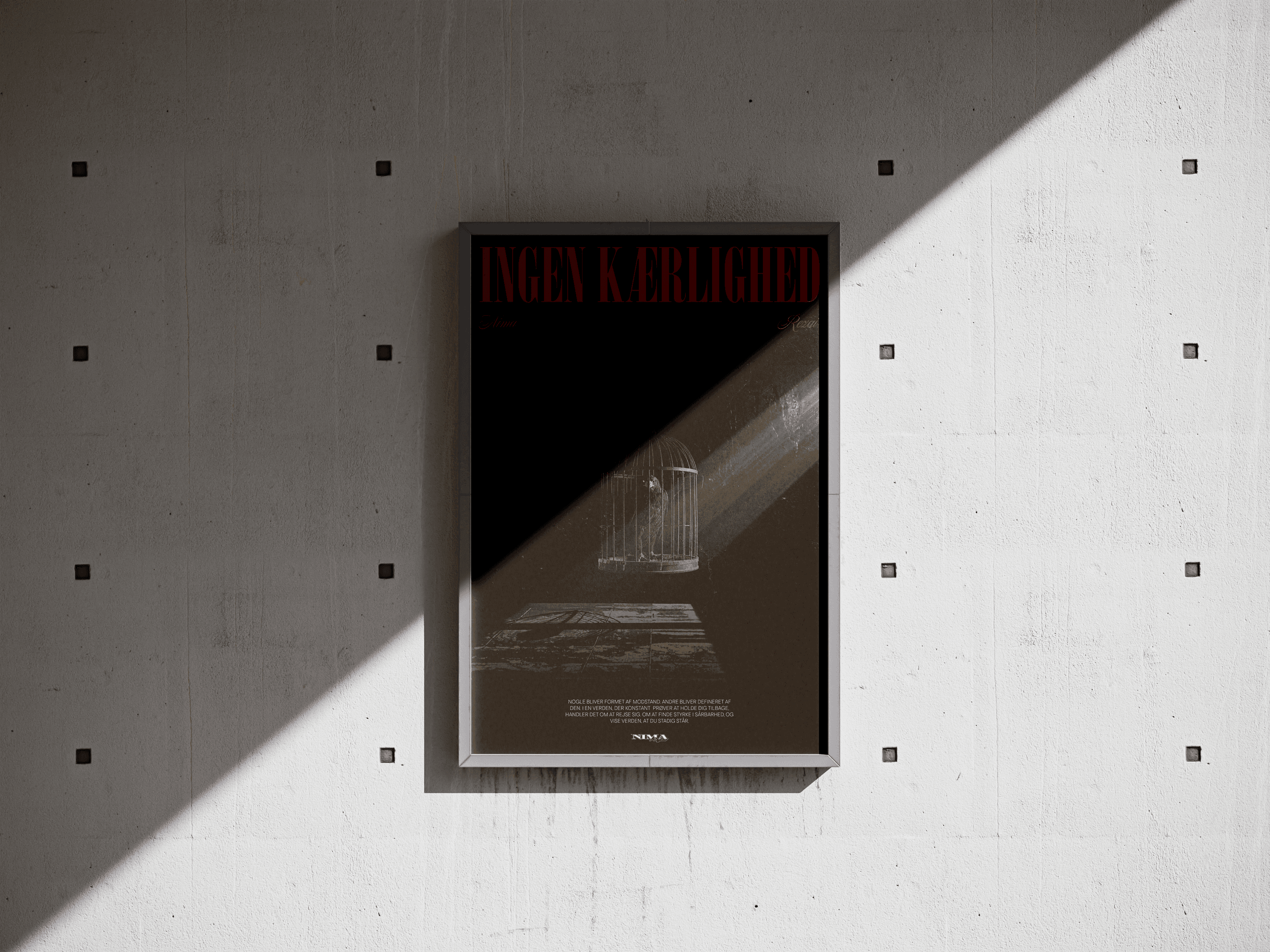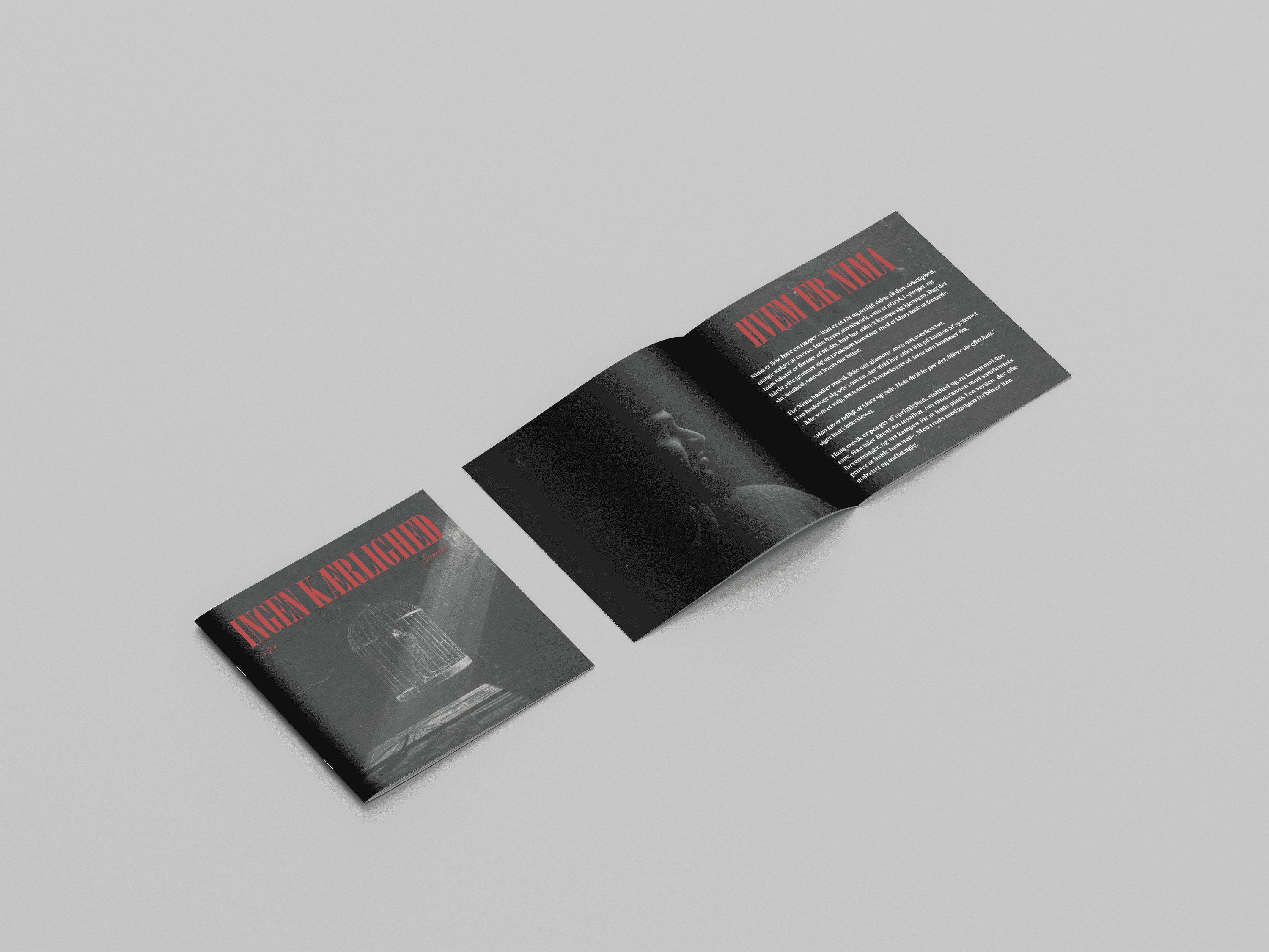 I dette projekt skulle der udvikles en keyvisual (en visuel identitet) til et stykke musik. Jeg slog mig sammen med kunstneren Nima og fik lavet nogle fysiske og digitale produkter til hans single“Ingen kærlighed”. Jeg udarbejdede herunder en kunstnerbiografi, booklet-tekst baseret på interview, opsatte sangteksten og skabte temaer, titler og citater, der passede til sangens univers. Opgaven gav mig mulighed for at kombinere storytelling, identitet og musikbranding, og det var særligt spændende at omsætte Nimas personlige fortælling til et samlet visuelt og tekstmæssigt udtryk.